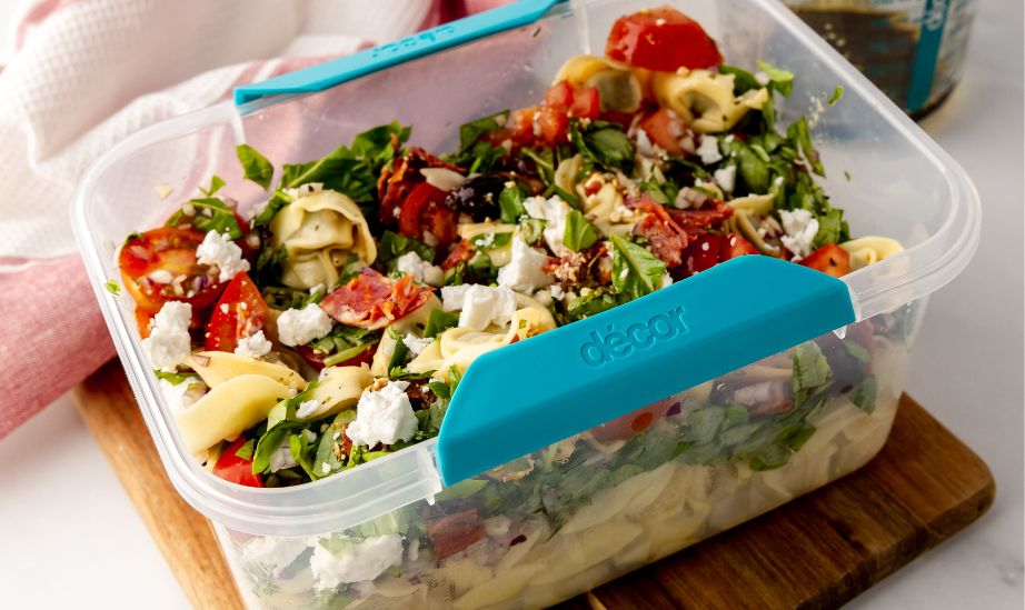2. In your Décor container, add cooked tortellini, salami, cherry tomatoes, basil leaves, feta, redonionand olives.